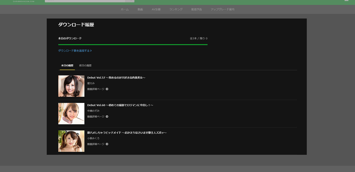 自分がカリビアンコムよりダウンロードした履歴が確認できます。