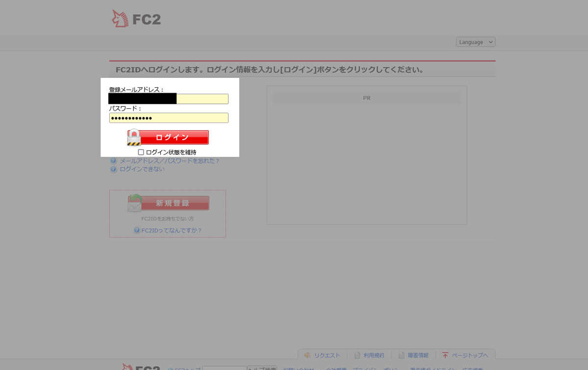 既にFC2の無料会員登録している方は、メールアドレスとパスワードを入力し「ログイン」をクリックします。