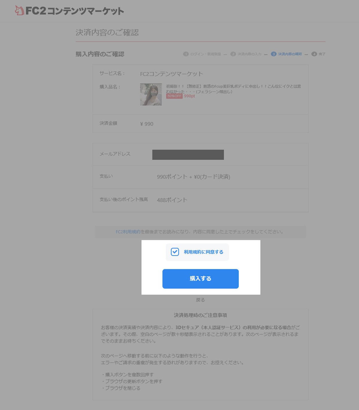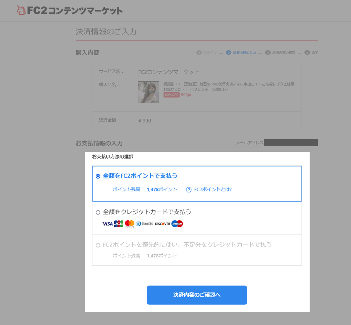 実際に管理人がFC2コンテンツマーケットサイトにて、アダルト動画をFC2ポイントで購入した流れを以下に記載します。