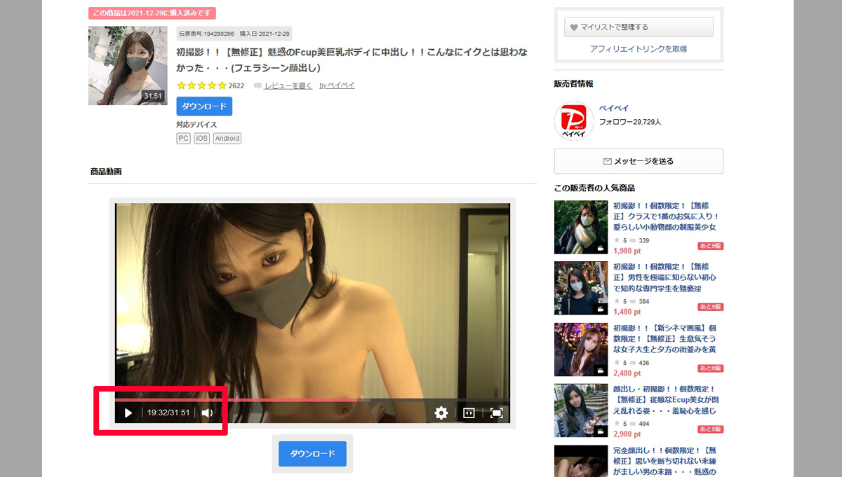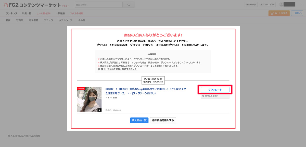 購入後ページへ進むと購入したアダルト動画のダウンロードが可能となります。