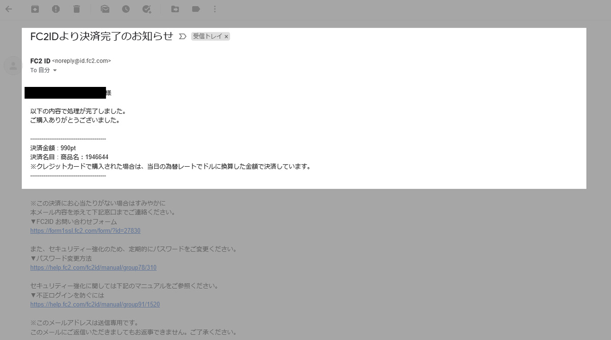 FC2で登録している自分のメールアドレスに動画購入の決済完了のお知らせメールが届きます。